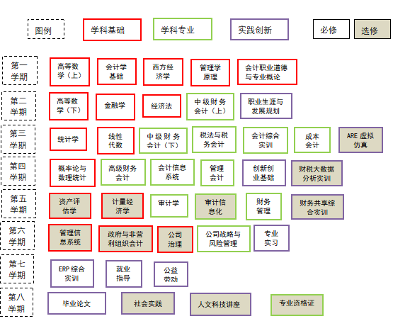 专业核心课程主要有:中级财务会计、财务管理、管理会计、成本会计、审计学、税法与税务会计、公司战略与风险管理、高级财务会计。近2年,为加快会计专业的信息化建设,陆续开设ARE虚拟仿真、财务共享、财务大数据分析、计算机审计等先进的信息化课程,为学生适应未来的信息化工作环境打下良好基础。