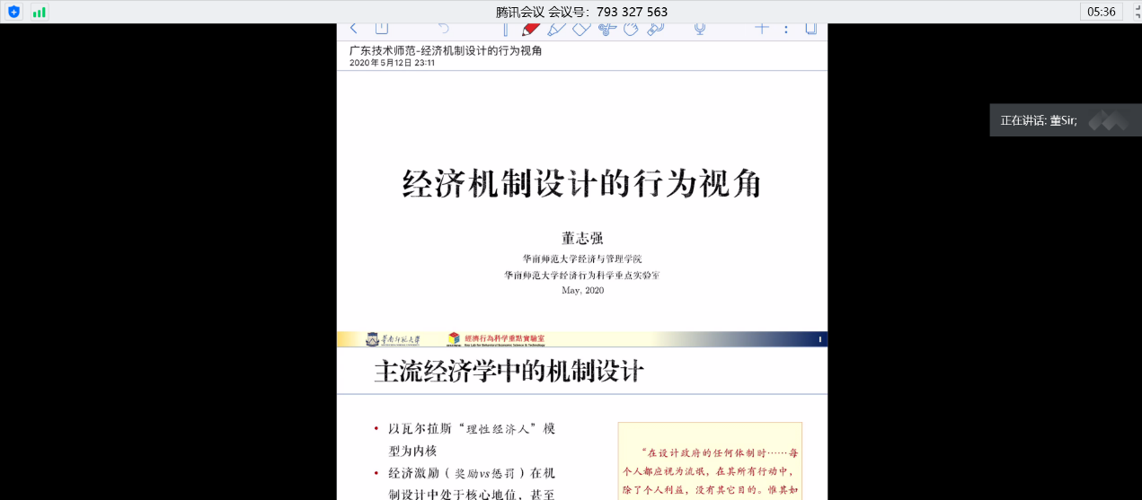 为更好地提升我校研究生科研能力及培养质量,2020年5月13日晚19:30分,我院邀请了华南师范大学经济与管理学院副院长,珠江学者,博士生导师董志强教授给会计硕士和教育硕士(财经商贸)研究生开设网上讲座《经济机制设计的行为视角》。taptap点点体育副院长林欣、taptap点点体育部分老师及taptap点点体育50多名研究生参加了讲座。
