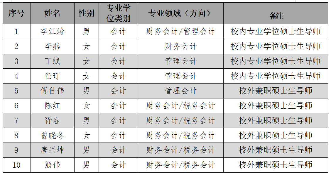 根据《广东技术师范大学研究生导师遴选办法》(广师大〔2020〕214号)《广东技术师范大学专业学位研究生校外实践导师遴选与管理办法(试行)》(广师大〔2020〕215号)文件精神和要求,经taptap点点体育学位评定分委员会会议研究决定,现将2020年拟新增会计硕士导师推荐名单予以公示,公示期11月17-19日。