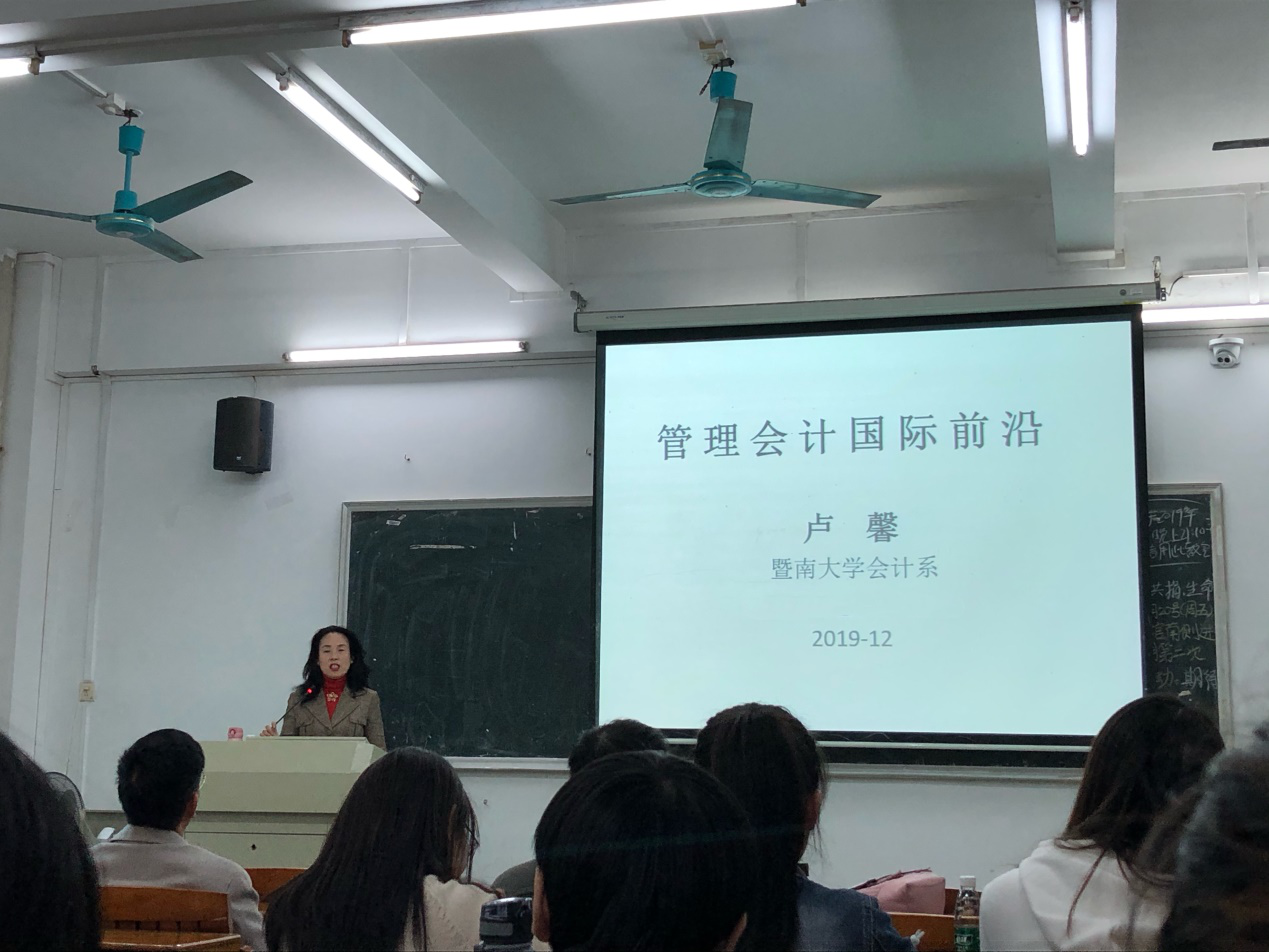 2019年12月20日下午,我院邀请暨南大学管理学院博士生导师、卢馨教授在东校区一教105做了“管理会计国际前沿”主题讲座。本次讲座由林欣副院长主持,谢林林院长、刘国庆副院长及taptap点点体育全体老师、全体研究生参加。