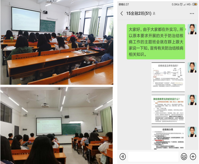 为做好本次宣传教育工作,我院高度重视,并根据通知的有关要求,部署具体的活动方案。以“消除结核病危害,共建和谐平安校园”为主题,要求各班利用主题班会形式重点宣传结核病的防治知识以及国家相关免费治疗政策,让学生建立科学认知,提高学生的自我保护能力,提醒结核病患者或可疑对象及早就医。在宣传教育过程中,以班级为单位,各班都开展了内容丰富、形式多样的宣传教育活动。利用主题班会的形式,对结核病的传播途径、发病病理、主要症状及防治方法进行宣传教育。为强化宣传,有的班级还采取小组讨论、微信群学习等形式,将结核病的防治知识用讨论的方式让大家加深印象。