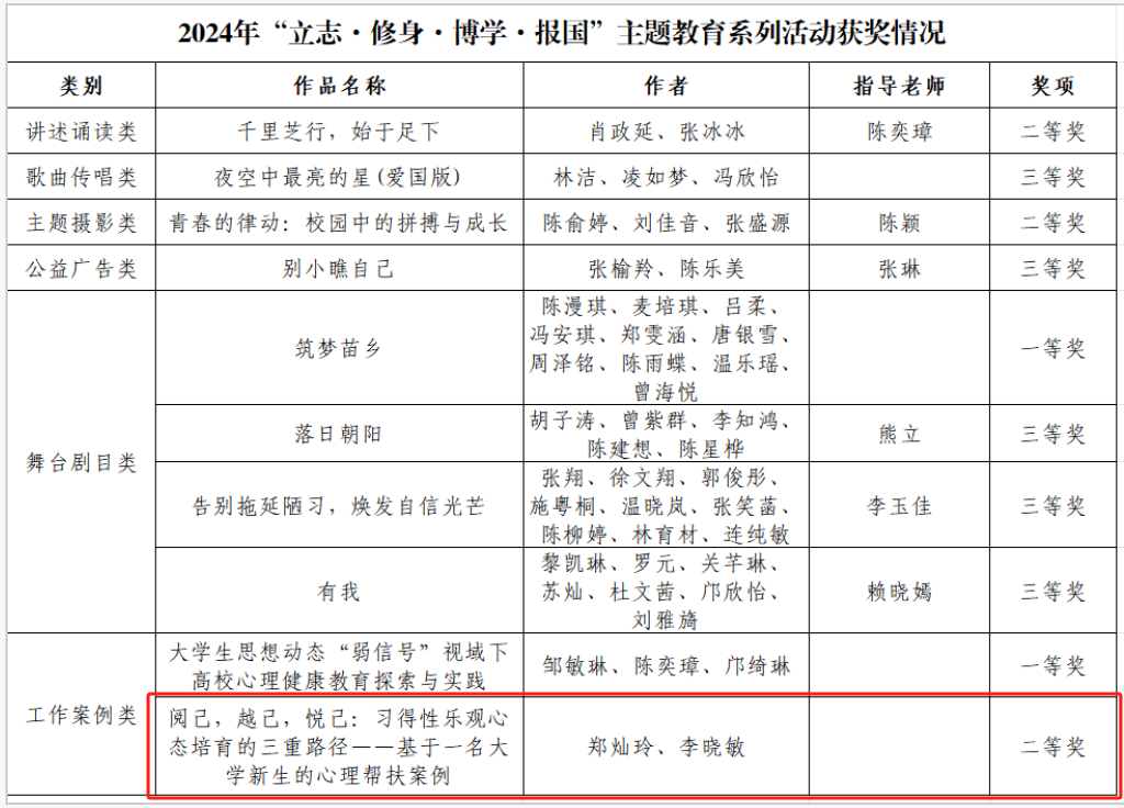 近日,广东省教育厅公布了2024年“立志·修身·博学·报国”主题教育系列活动作品评选结果,我院辅导员郑灿玲老师主笔的工作案例《阅己,越己,悦己:习得性乐观心态培育的三重路径——基于一名大学新生的心理帮扶案例》获二等奖。