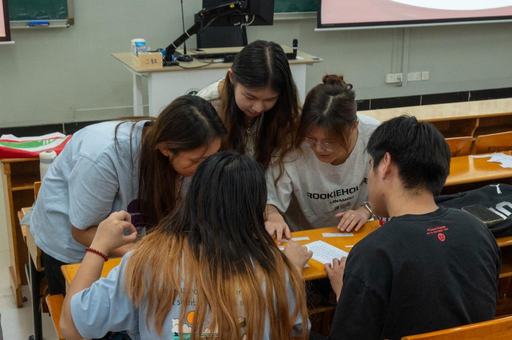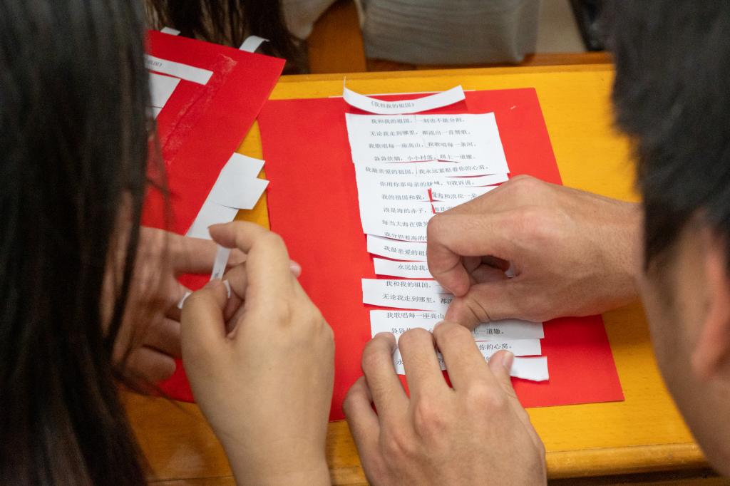 随后,在“歌颂祖国拼贴诗”主题活动环节,团支部书记陈韵颐让团员们合作拼贴了“我和我的祖国”的歌词以及齐唱了这首红色歌曲。深入人心的歌词让团员们迅速完成了活动任务,并在一声声“我最亲爱的祖国”中唱出了心中的家国情怀,提高了团组织的凝聚力。