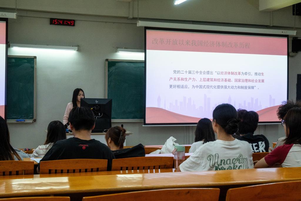 在“历史时间线”主题活动中,团支部书记陈韵颐有效地将党的二十届三中全会精神与团员的专业基础相结合,组织团员们学习“改革开放以来我国经济体制改革历程”专题内容,并让他们在纸板上匹配历史时间点与历史事件,以此来帮助他们深刻理解进一步全面深化改革的重要性和必要性。同时,该主题活动有助于团员们把握“以经济体制改革为牵引”的改革方向,鼓励他们在学习实践中淬炼本领,更好地将个人梦想融入国家发展。