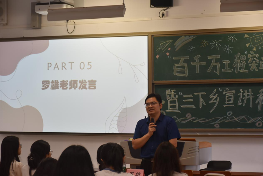 随后,罗雄书记作指导讲话。他深刻阐释了“三下乡”社会实践与“百千万工程”突击队行动的内在逻辑关联,指出“百千万工程”是广东省对全国性“三下乡”活动的本土化实践,二者本质一脉相承,因地域特色与发展阶段的不同而形成表述差异。同时,他对“百千万工程”突击队行动的相关政策进行了详细解读,并从队伍注册结对流程、活动持续时间、内容等多个维度展开系统性说明。