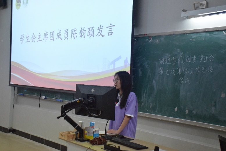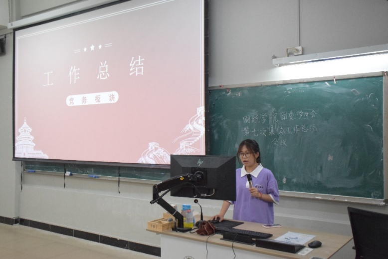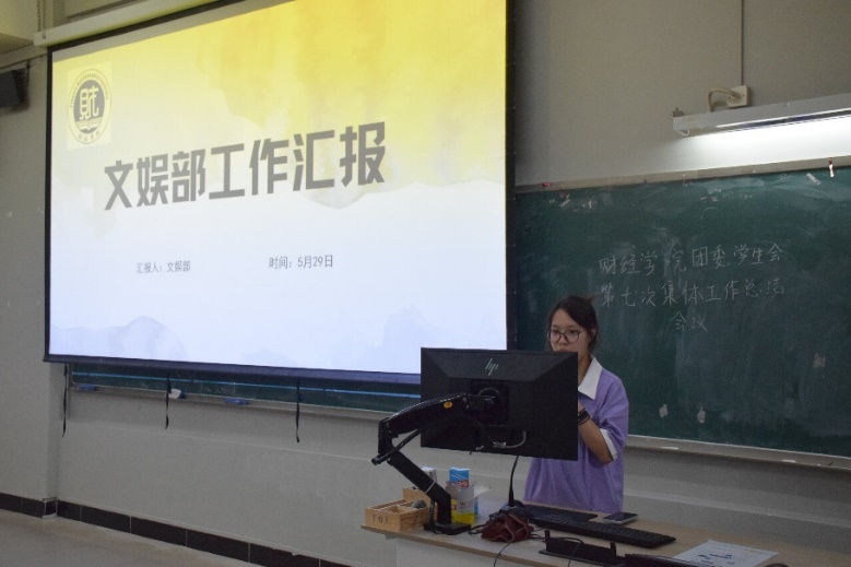 会议伊始,各部门负责人依次上台进行工作汇报。组织部负责人林海纳提到本月组织了发展党员工作,收集了入团申请书,开展了党课培训,对五四评优获奖者进行了表彰;文娱部负责人刘颖贤提到本月成功举办了“财韵律步,踏绘流光”音乐主题夜跑活动,下月将开展部门会议及司仪队考核等工作。此外,其余部门也分别就各自领域的工作成果、经验及存在的问题进行了细致的汇报。