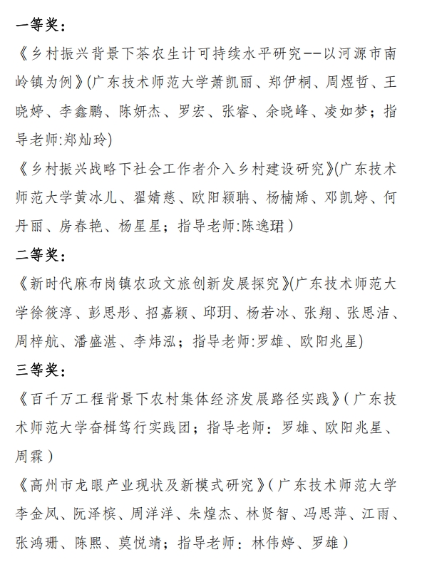 其中,由萧凯丽、郑伊桐等同学组成的团队聚焦茶农生计议题,围绕《乡村振兴背景下茶农生计可持续水平研究——以河源市南岭镇为例》开展实证调研,荣获一等奖。黄冰儿、翟婧慈等同学提交的《乡村振兴战略下社会工作者介入乡村建设研究》同获一等奖,展现我院在社会服务领域的专业深耕与实践探索。徐筱淳等同学的《新时代麻布岗镇农政文旅创新发展探究》获二等奖,《农村集体经济发展路径实践》《高州市龙眼产业现状及新模式研究》两项作品则荣获三等奖。