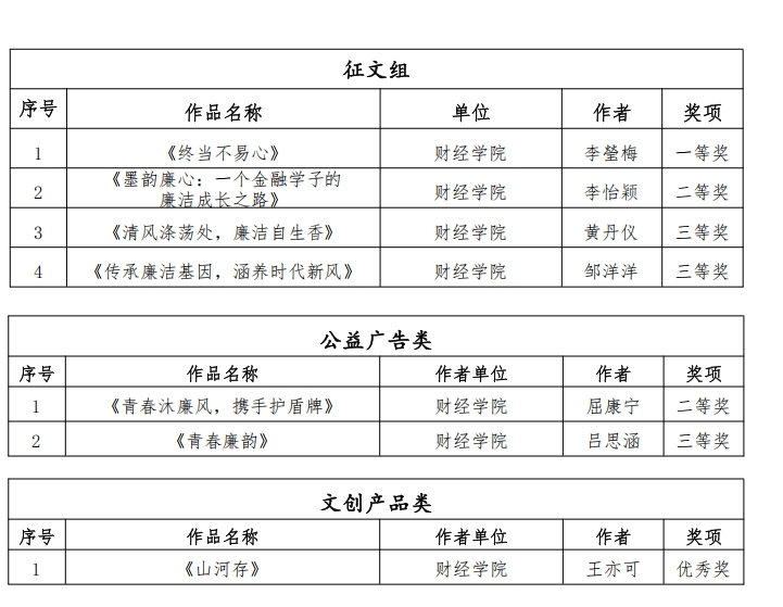 在廉洁主题征文评选中,2022级会计学李瑩梅同学的作品《终当不易心》荣获一等奖,2022级金融学李怡颖同学《墨韵廉心:一个金融学子的廉洁成长之路》获二等奖,2023级会计学黄丹仪与2022级金融学邹洋洋同学分别凭借《清风涤荡处,廉洁自生香》《传承廉洁基因,涵养时代新风》荣获三等奖。