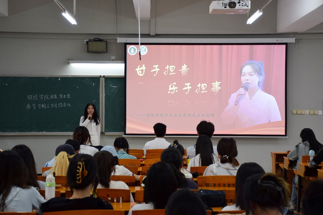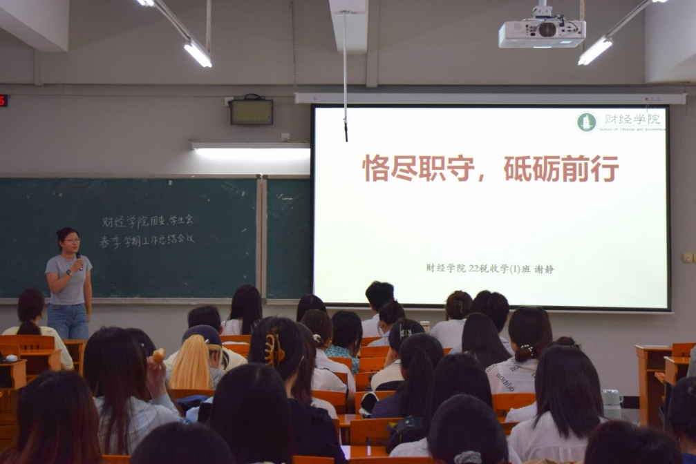 会议的第一项议程是团委、学生会代表述职,首先进入主席团代表述职环节。团委学生兼职副书记谢静从“固本·鼎新·致远”的角度,系统梳理了团委学术科技部在思想引领、学术创新及团队建设中的成果。她指出,要将“财通天下、经世致用”院训融入学科竞赛和实践调研,指导学术科技部三分队协同发力,针对当前的不足则需从传承、创新、交流这三方面上反思精进,并呼吁学生干部要以恪尽职守的态度服务同学成长。