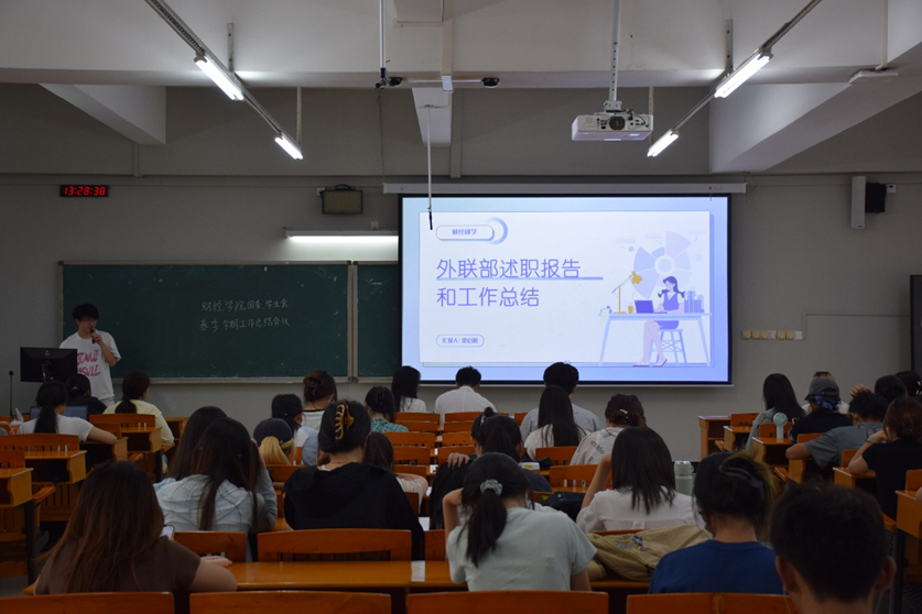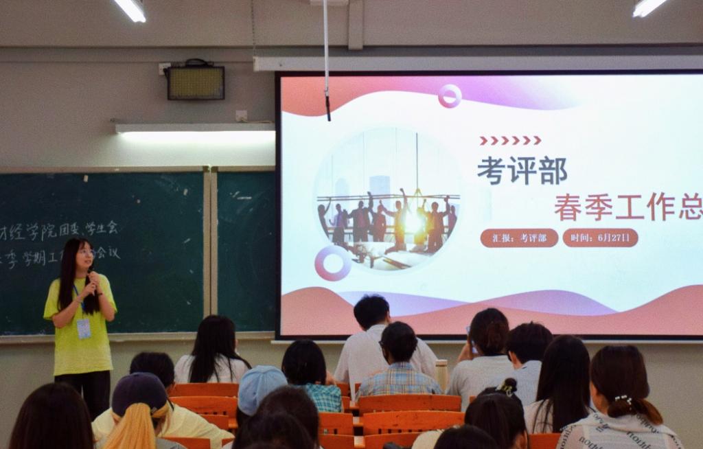 随后,各部门负责人代表逐一进行述职。例如,考评部汇报代表黄冰儿回顾了本学期毕业班各类奖学金的评比工作,并提出接下来将做好暑期非毕业班综测的前期准备工作。外联部负责人梁启明谈到,“财流易站·循环经济”校园集市活动的成功举办不仅帮助同学们实现了闲置资源的循环利用,而且传递了绿色环保理念。