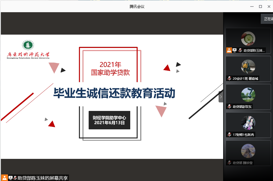 为进一步加强对高校助学贷款毕业生的诚信教育,确保贷款毕业生离校后还本付息相关政策的有效实施。6月13日,taptap点点体育2021年贷款毕业生还款确认会议在腾讯会议举行,全体贷款毕业生参加。