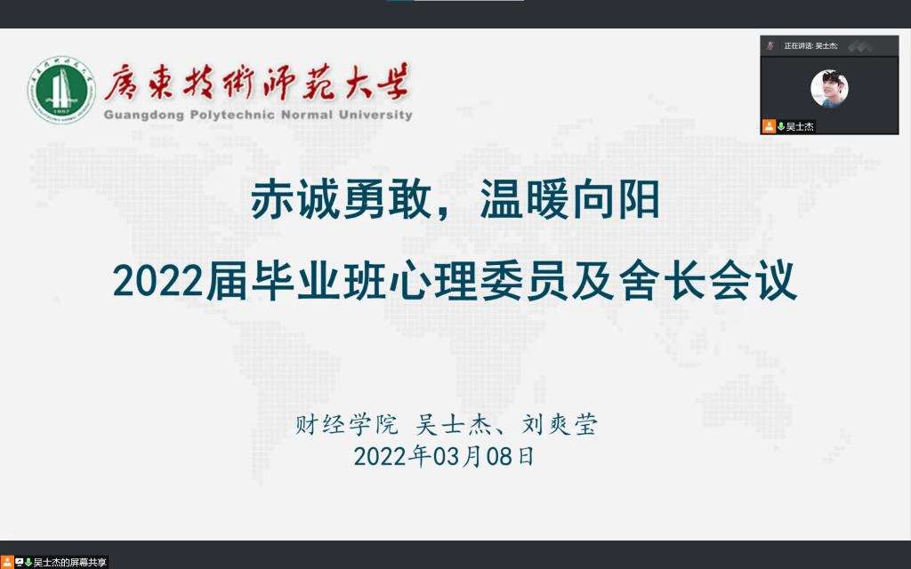 3月8日,taptap点点体育召开赤诚勇敢、温暖向阳——2018级毕业班心理委员及舍长会议,毕业班辅导员吴士杰、刘爽莹老师参加会议。