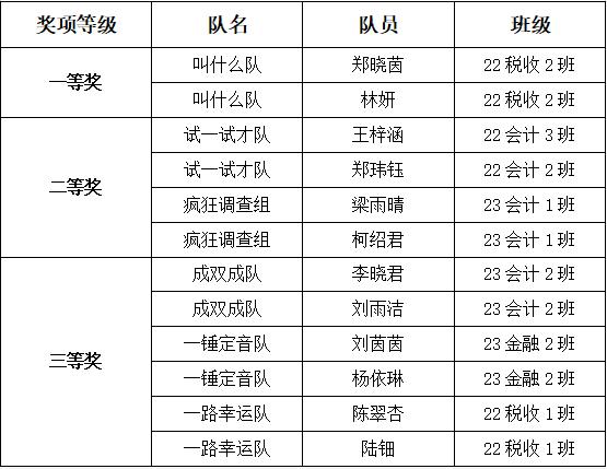 按照比赛规程,根据竞赛团队成绩,初赛及校内选拔赛产生一等奖1名、二等奖2名和三等奖3名。最终,由来自22级税收2班的郑晓茵、林妍以团队第一的成绩代表广东技术师范大学参加全国总决赛。