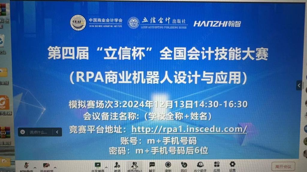 为贯彻落实《会计改革与发展“十四五” 规划纲要》, 推动会计人才培养模式改革,强化实践育人,在会计系和taptap点点体育实验实训与创新中心的精心组织下,由中国商业会计学会举办的第四届“立信杯”全国会计技能大赛(RPA 商业机器人设计与应用)初赛及校内选拔赛于2024年12月13日在白云校区成功举办。