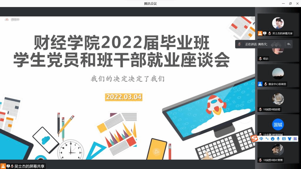 为了进一步做好2022届毕业生就业工作,指导毕业生树立正确的职业观和人生观,帮助毕业生明晰职业方向、疏导就业压力,3月4日taptap点点体育召开毕业班学生党员和班干部就业座谈会,根据疫情防控要求,座谈会采用腾讯会议线上开展。taptap点点体育党委副书记黄伟文、各毕业班班主任、各学生党支部书记、就业辅导员吴士杰老师、刘爽莹老师、各毕业班学生党员和学生干部参加座谈会。座谈会由吴士杰主持。