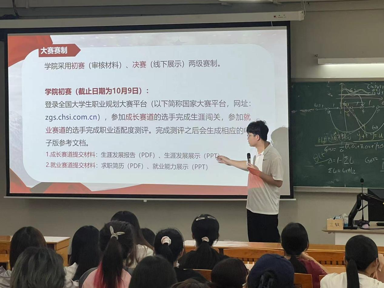 紧接着,陈逸珺就近期开展大学生职业规划大赛工作进行部署。此次比赛旨在全面提升学生的职业规划意识与能力,会上详细介绍了大赛内容、大赛赛制、参赛安排和参赛要求。内容涵盖职业生涯设计、职业目标设定以及行动计划制定等多个方面。此次赛事规模空前,意义重大,涵盖全院所有年级。会上特别指出,职业规划不仅是一次赛事的参与,更是学生为未来职业生涯奠定基础的良好契机,通过参赛,学生能够更加明确职业方向,提升自我规划能力。