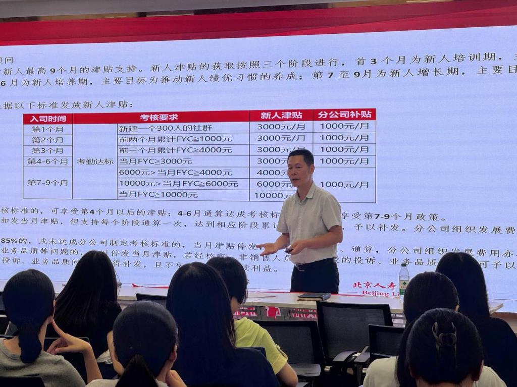 谈及实践教学基地,陈总强调其核心价值理念“实习基地是理念与实践的桥梁,绝非简单的就业预演。同学们在此既能学习财税、法律等基础理论知识,又能掌握为客户解决人身保障、资产管理问题的实操技能,通过实习完成职业能力的提升,为未来职场发展筑牢根基。”此外,陈总还针对见习营销员/保险顾问岗位,细致说明考核要求、不同入司时长对应的新人津贴及分公司补贴政策,清晰呈现职业发展路径。