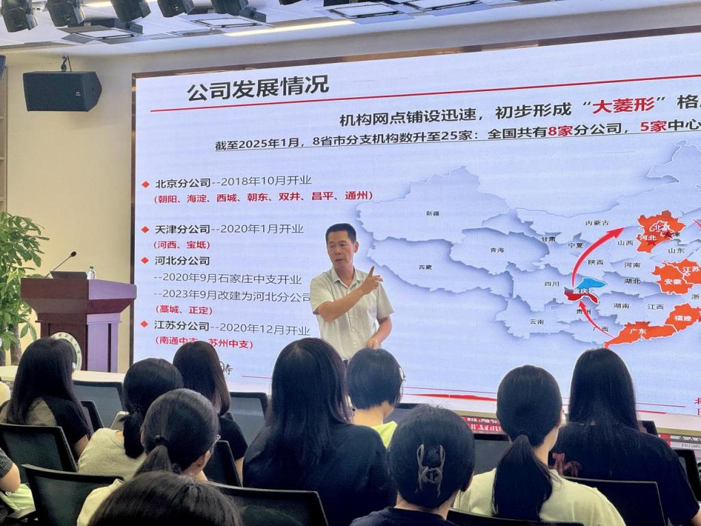 宣讲伊始,陈总围绕北京人寿的发展历程、企业文化等方面展开介绍,着重解读行业新兴的“直播+保险”销售模式,展现数字化营销对保险业务拓展的推动作用。同时,陈总详细阐释公司成熟培训体系,从专业知识授课到实战技能打磨,助力新人快速适应岗位;通过对产品体系的讲解,让同学们清晰了解保险产品矩阵,明白如何精准匹配客户需求 。