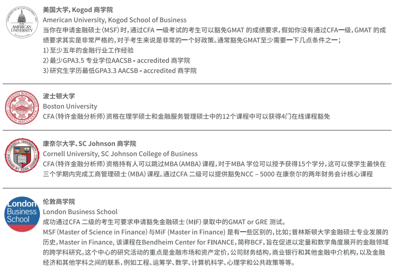 国外商科名校(例如波士顿大学,康奈尔大学,伦敦商学院,多伦多大学等)的商学院在申请留学生时,阶段性通过CFA考试可豁免GMAT的成绩要求,部分学校可获得课程豁免。