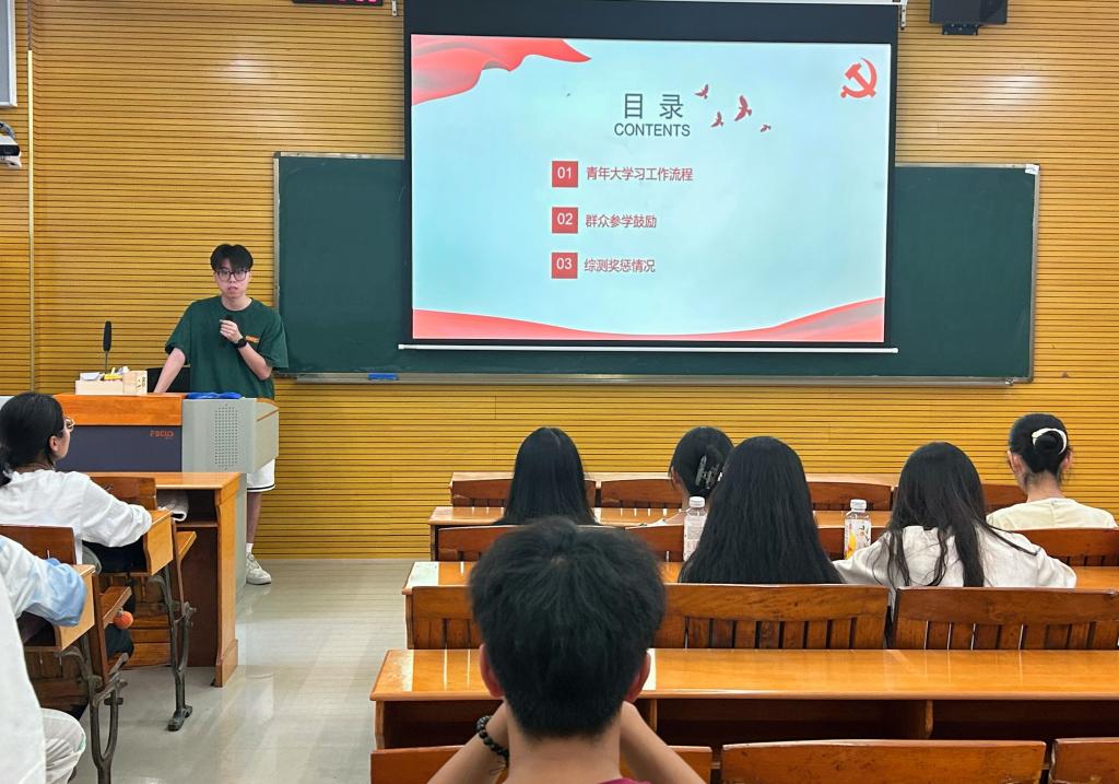 会议主要围绕“青年大学习”工作流程、群众参学鼓励和奖惩情况展开。会议第一部分,宣传部工作人员对转发学习通知和督促参学的各项工作时间节点进行了讲解,对如何高效收集参学数据提出了合理建议,重点讲解了每期参学率录入的操作过程,要求各宣传委员在规定时间内及时记录并向学院团委宣传部反馈观看情况。会议第二和第三部分,宣传部工作人员提出要在班级营造浓厚的学习参与氛围,鼓励广大共青团员和青年朋友们积极参与学习“青年大学习”网上主题团课,带动更多人加入党的思想理论的学习热潮中。同时对未参学团员和群众参学情况的奖惩制度进行了解释和说明,便于宣传委员进一步了解有关处理原则。