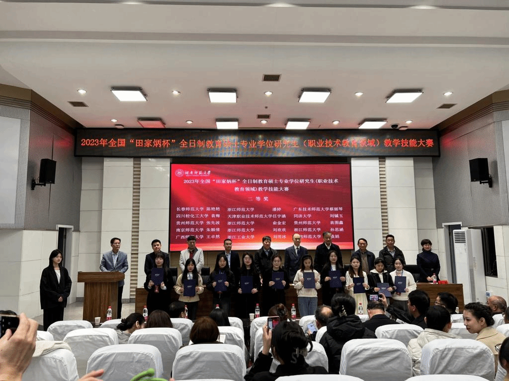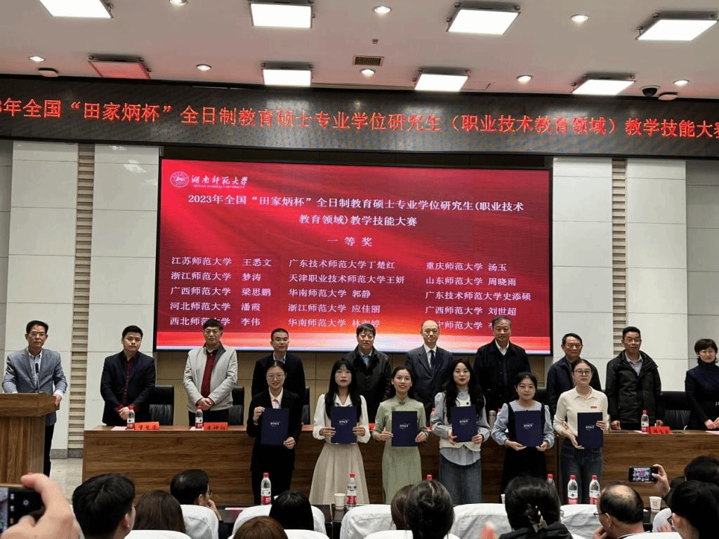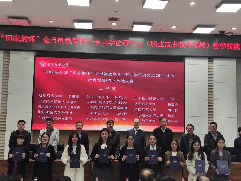 11月10日至12日,在田家炳基金会、大赛专家委员会和职业技术教育领域大赛专家组的指导下,由湖南师范大学主办的2023年全国“田家炳杯”全日制教育硕士专业学位研究生(职业技术教育领域)教学技能大赛决赛圆满结束,我院四位学子以出色的表现分别获得财经商贸组一等奖、二等奖和三等奖,获奖率100%,取得了突破性的成绩。