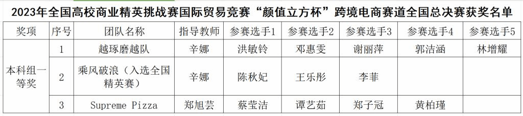 11月2日,2023 年全国高校商业精英挑战赛官网公布了2023 年全国高校商业精英挑战赛国际贸易竞赛“颜值立方杯”跨境电商赛道全国总决赛精英赛的通知。其中我院三支学生队伍表现优异,三支参赛队伍均获得总决赛一等奖。次日,大赛官方公布晋级国际贸易竞赛“颜值立方杯”跨境电商赛道全国总决赛精英赛入围的通知,我院一支队伍成功入围精英赛。