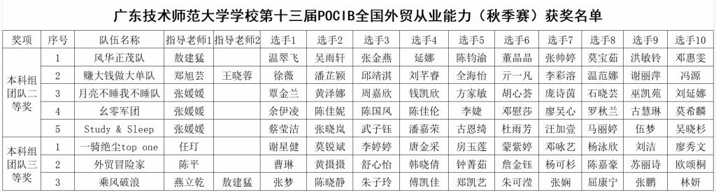 11月14日,由中国国际贸易学会主办的第十三届POCIB 全国外贸从业能力大赛(秋季赛)圆满收官。我院共有五支队伍获得团体二等奖,三支队伍获得团体三等奖。据悉,POCIB 全国外贸从业能力大赛以国际贸易仿真训练为核心方法,将外贸企业的岗位培训和相关院校的人才实践教学环节融为一体,推进院校培养高技能实用型人才的进程。