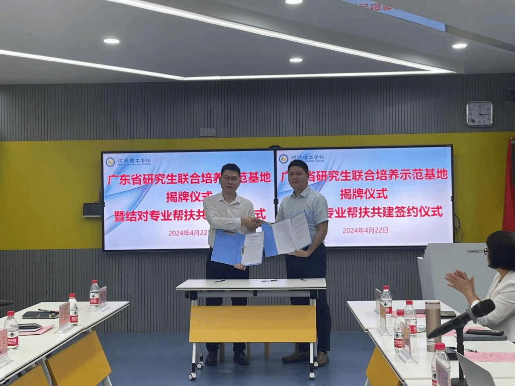 在河源理工学校的座谈交流会上,河源理工学校党委书记李雄伟首先介绍了学校的总体办学情况,并提出河理工在创建广东省高水平中职学校过程中遭遇的瓶颈以及重点专业建设的帮扶诉求。在随后举行的“广东省研究生联合培养示范基地”揭牌仪式暨结对专业帮扶共建签约仪式上,我院与河理工商务管理部签订电子商务专业帮扶共建协议。