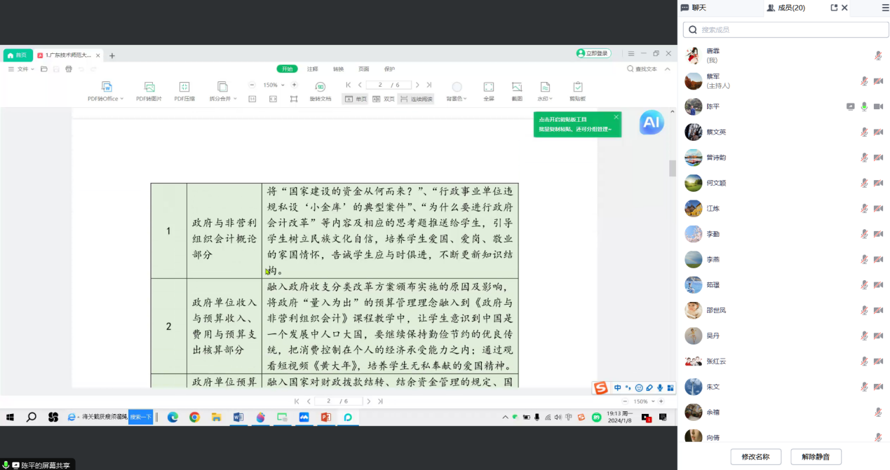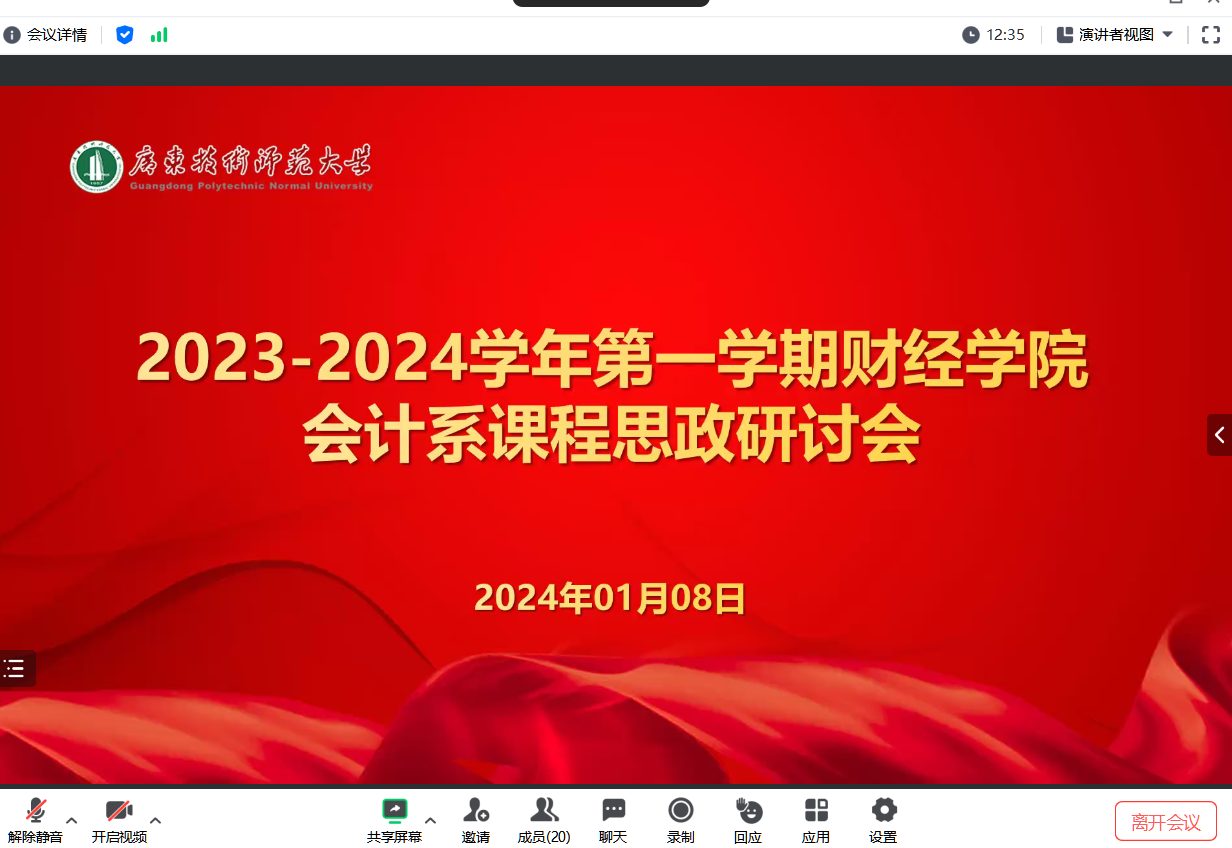 会计系2024年1月8日召开课程思政教学研讨会,会计系全体教师参加。研讨会分为三部分:陈平副教授分享课程思政课题申报经验;会计系教师课程思政教学经验交流;刘国庆副院长总结发言。