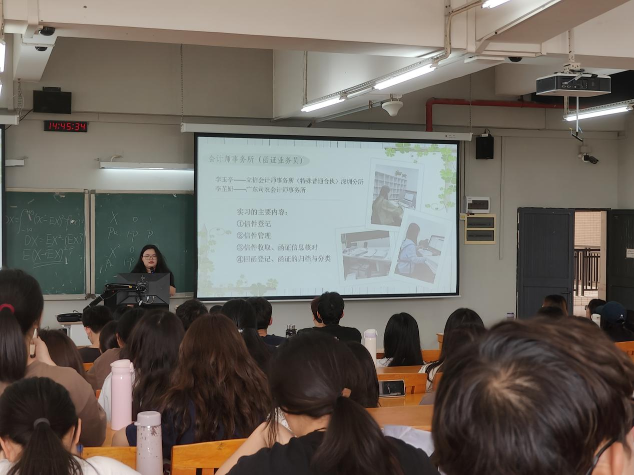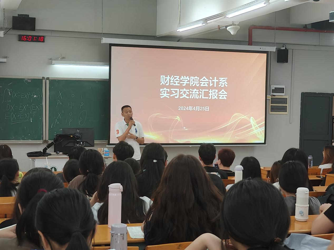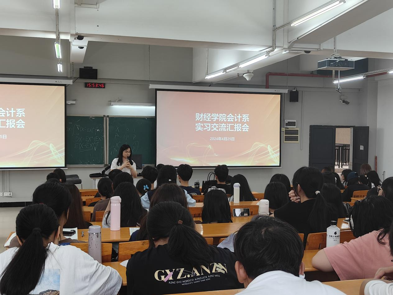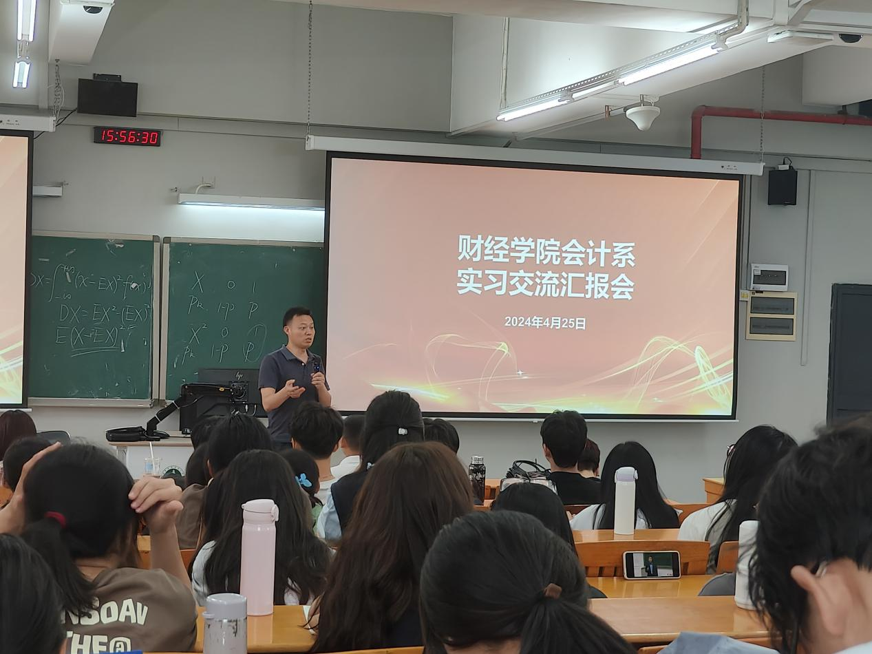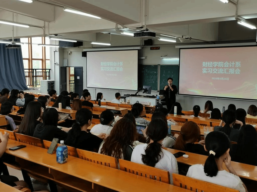 4月25日下午,会计系在白云校区在3教314召开专业实习交流会。本次汇报会旨在搭建一个实习经验交流的平台,让21级学生分享他们在实习过程中的收获与体会,为即将踏入实习岗位的22级同学提供宝贵的经验和建议。会计系系主任蔡军教授、系党支部书记陈平副教授、会计专业负责人周建庆博士、财会教育专业负责人唐霏副教授、向倩博士, 21级18位实习生代表以及22级会计专业和财务师范教育专业的同学参加会议。