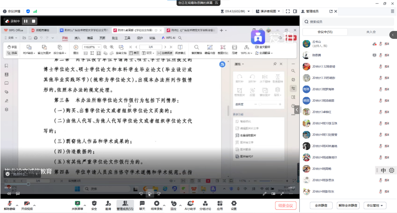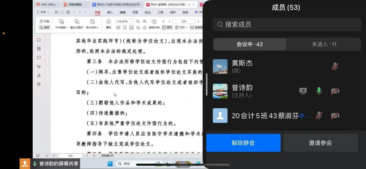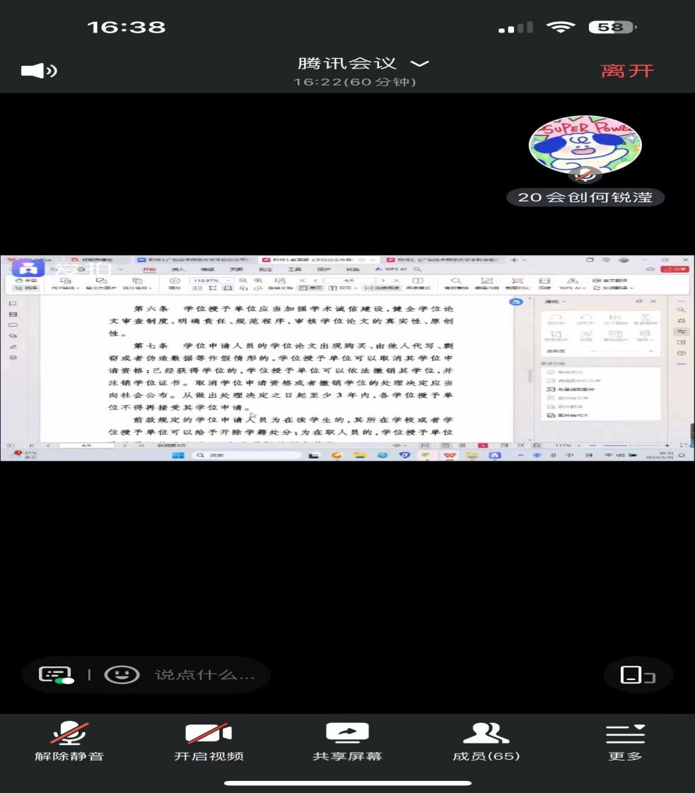 2024年3月31日,会计系在线上通过企业微信举办了毕业论文诚信写作学习会议,会计系主任、专业负责人、骨干教师和2020级会计学专业、财务会计教育专业300余名学生参加,会计系曾诗韵副主任主持会议。会议围绕《教育部学位论文作假行为处理办法》和《广东技术师范大学本科毕业论文(设计)工作管理办法》展开,旨在帮助学生全面了解学位论文作假的界定及处理流程,学习如何规范毕业论文各个环节,确保毕业论文的质量和诚信。