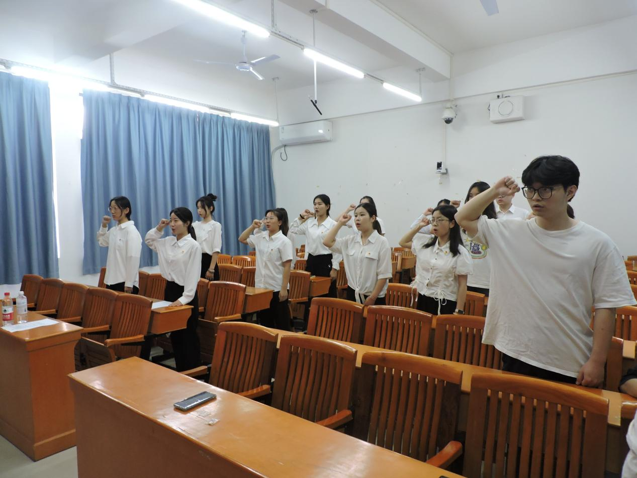 活动伊始,先由主持人介绍到场的老师,接着全体奏唱国歌,宣读新团员名单,由陈逸珺老师为新发展团员颁发团徽。活动现场,气氛热烈而庄重,在鲜艳的团旗前,taptap点点体育辅导员陈逸珺老师带领新团员们举起右拳,庄严宣誓:“我志愿加入中国共产主义青年团,坚决拥护中国共产党的领导,遵守团的章程,执行团的决议,履行团员义务,严守团的纪律,勤奋学习,积极工作,吃苦在前,享受在后,为共产主义事业而奋斗。”