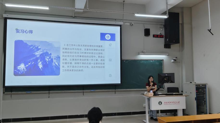 随后,21级实习生们陆续上台汇报自己的实习情况,分享他们的实习经验,为未来学弟学妹展开实习工作提出针对性的建议,并鼓励学弟学妹努力学习,提升能力。具体包含以下方面: