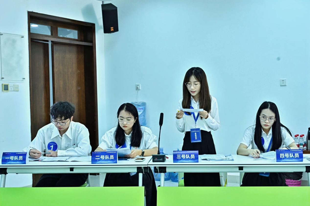 面对华南师范大学辩手对我方案例“解决方案”的猛追猛打,杨心悦所在队伍的三号辩手朱磊凭借对自己案例撰写中所负责版块的了解,成竹在胸,反驳了对方一次又一次的追问,展现了我院学子扎实的知识储备和严密的逻辑框架。