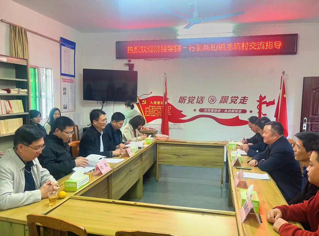 随后学院一行来到周田镇龙坑村,与镇领导和村干部进行座谈交流并参观村容村貌。在听取村集体经济发展和党组织建设基本情况介绍后,学院负责人表示将充分利用学院部分博士教师专门研究农村农业经济发展、具有多年乡村振兴调研的经验等优势,积极为镇村建设、农民增收提供智力支持。学院老师在参观村容村貌的过程中进一步了解村交通、人口、物产等情况,提出了促进村集体经济发展的措施和建议。