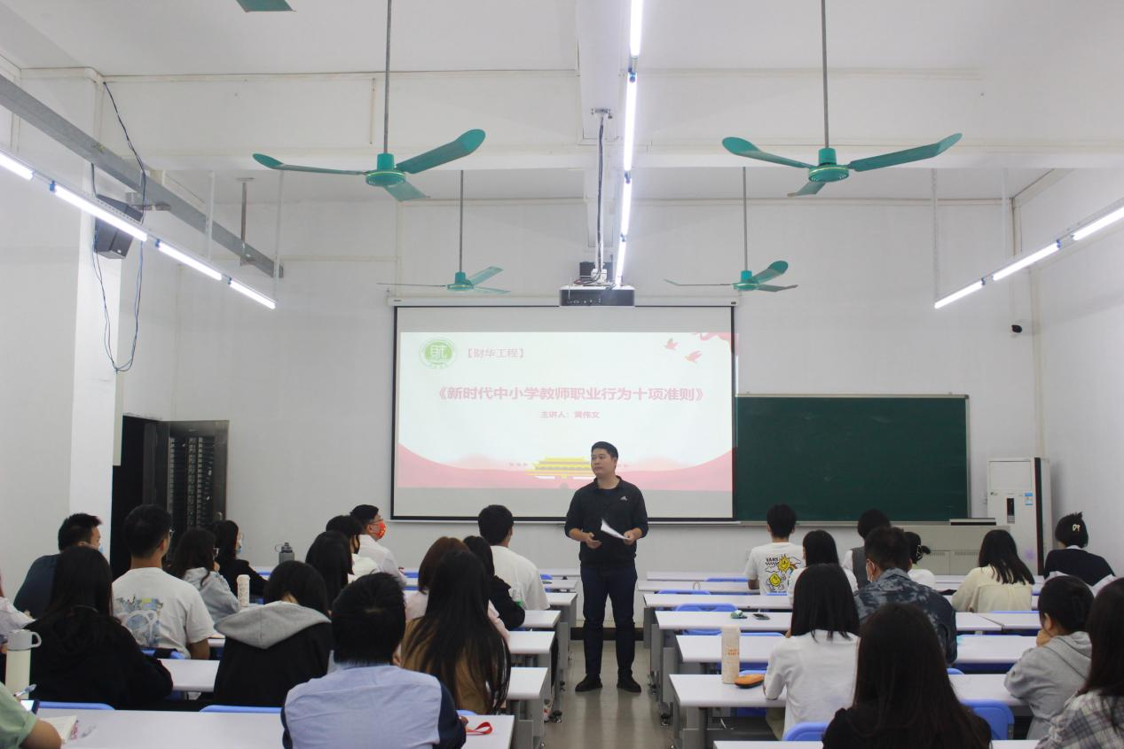 为深入贯彻落实习近平总书记关于教育的重要论述和给北京师范大学“优师计划”师范生的回信精神,进一步加强师范生的师德规范建设,帮助师范学生深刻理解立德树人根本任务,教育引导师范生坚定理想信念、厚植爱国情怀、涵养高尚师德,进一步提高师范生的培养质量。10月11日,taptap点点体育在白云校区二教102课室举办了2022年“财华工程”之师范生“师德养成教育活动月”专题讲座。本次讲座邀请taptap点点体育党委副书记黄伟文和副院长刘国庆两位老师主讲,学院全体师范生参会聆听。
