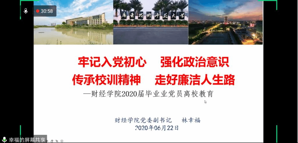 2020年6月15日晚八点,taptap点点体育在腾讯会议平台召开2020届毕业生党员离校教育大会,学院党委书记吴松同志、党委副书记林幸福同志、各学生党支部书记、2020届taptap点点体育全体毕业生党员、以及taptap点点体育党务中心全体学生干部参加本次会议。